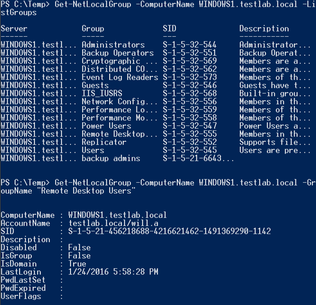 Also note that the old Get-NetLocalGroups function has been depreciated- if you’d like to list the local groups on a machine, use the -ListGroups option. You can also specify the local group you’re querying for with -GroupName, for example Get-NetLocalGroup -GroupName “Remote Desktop Users” WINDOWS1.testlab.local.