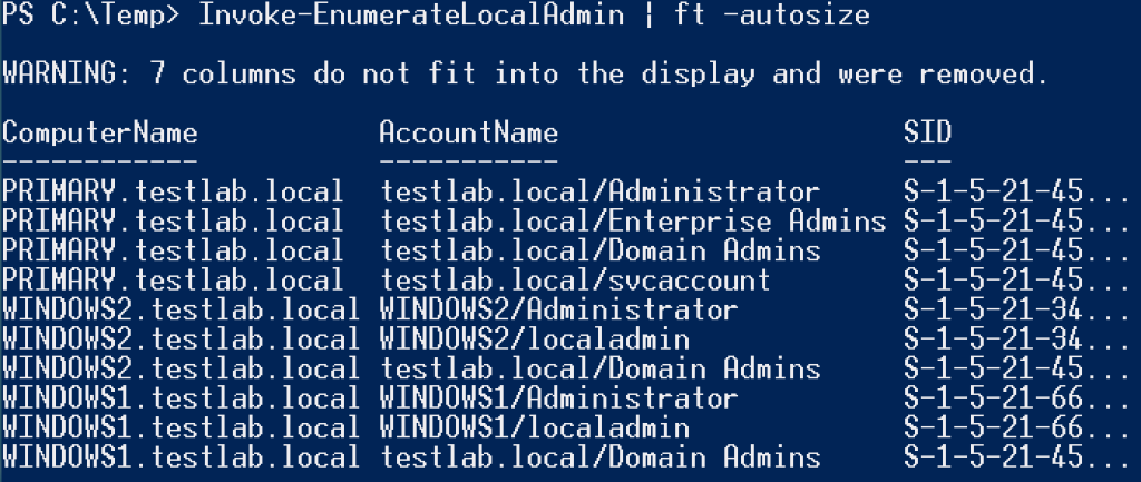 If you’re on a shorter timeframe pentest, and want to run this functionality on ALL machines in the network, you can execute Invoke-EnumerateLocalAdmin (with optional -Threads X for threaded functionality). This will perform local admin access enumeration on all computers listed in Active Directory and output everything to a nicely sortable .csv. But be warned: this can be very slow for large environments, and it is definitely not stealthy, as you are touching every machine as quickly as your system will allow.