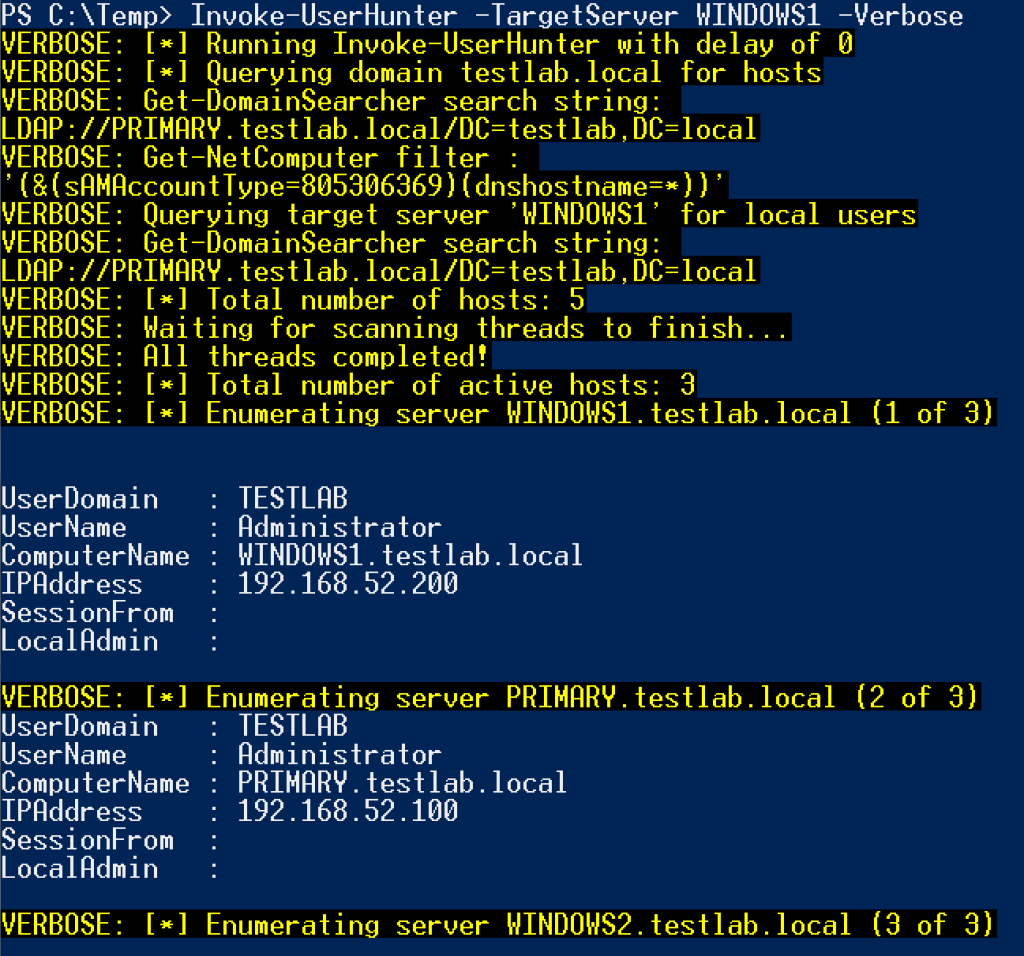 This has greatly sped up user hunting engagements with complex, nested group relationships. This functionality was also recently added to Invoke-UserHunter and Invoke-UserHunter -Stealth (formerly Invoke-StealthUserHunter), with the -TargetServer <SERVER> argument. This will perform a recursive Get-NetLocalGroup <SERVER> -Recurse enumeration of a target server, and hunt for where any of these users are logged in on the network:
