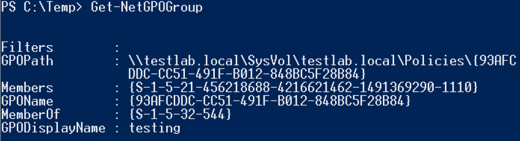 And just like Get-NetLocalGroup, these functions don’t need elevated access to query this information. However, Find-GPOComputerAdmin will only return domain results, i.e. local user accounts will not be returned.