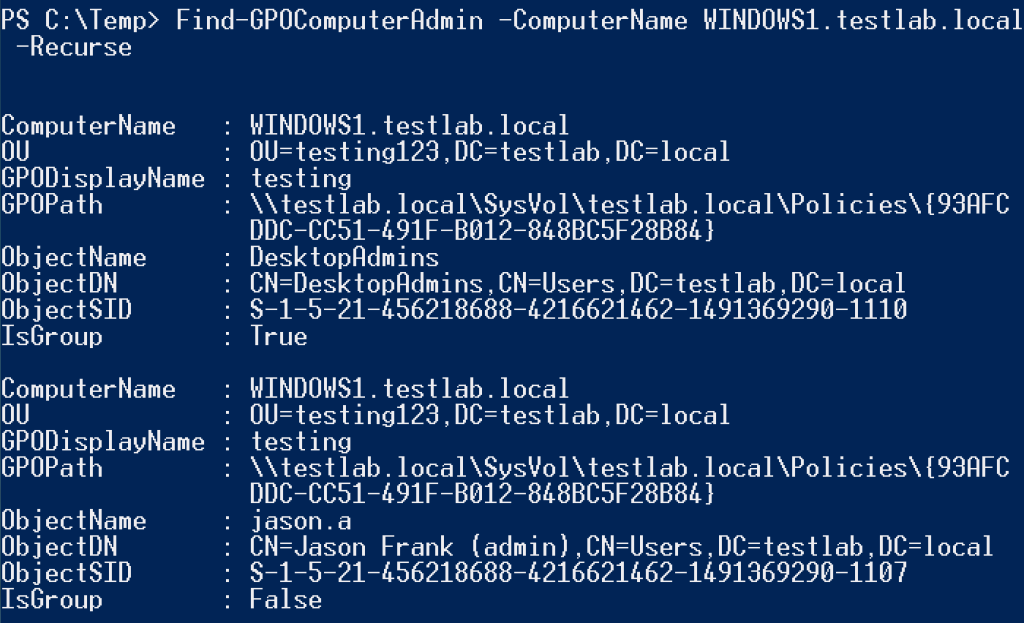 There’s also a functional inverse, Find-GPOComputerAdmin, that will return what objects have membership for a specified -LocalGroup on a target system. The -Recurse flag will resolve the membership of any results that are a group themselves.