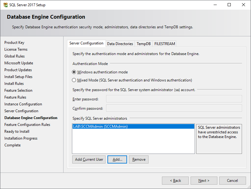 In the Database Engine Configuration, click Add Current User or add another user/SCCM Admin groups and click Next.