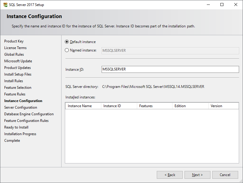 In the Instance Configuration, leave the default instance ID, MSSQLSERVER click Next to continue.