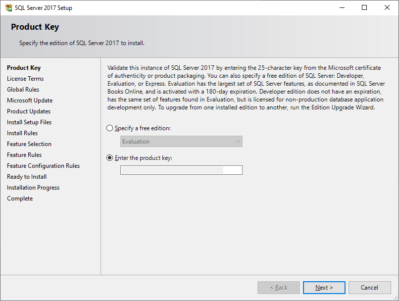 In the Product Key page, choose for the Evaluation or enter a product key then click Next to continue.