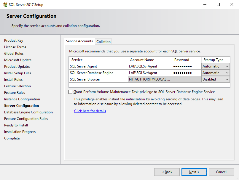 Note: Best practice in Production, the SQL Server Agent and SQL Server Database Engineer should each have a domain accounts. For their account’s passwords should be configured not to expire and cannot be changed (so make sure these service accounts are restricted not have an interactive logon rights as well).