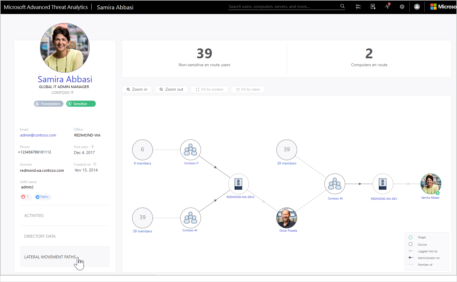- С помощью учетной записи пользователя службы каталогов шлюз ATA запрашивает конечные точки в организации для обнаружения локальных администраторов, использующих SAM-R (вход в сеть), чтобы построить график путей бокового смещения. Дополнительные сведения см. в разделе Настройка необходимых разрешений для SAM-R.