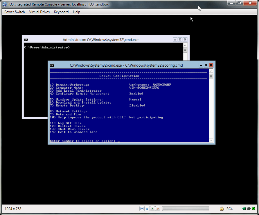После завершения установки, первое, что видит пользователь — пара окон CMD и открытая в ней же утилита базовой настройки сервера — Sconfig. Не густо, но для сервера нам вполне хватит.