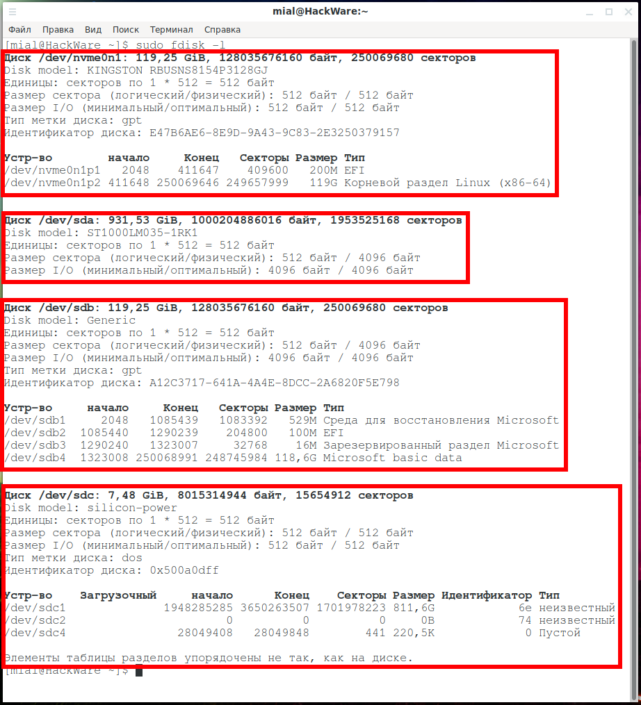 На самом деле, вывод команды неполный (пропущена USB флешка) и в нём полностью отсутствует информация о разделах. Тем не менее она может помочь вам сориентироваться в присутствующих на вашей системе дисках.