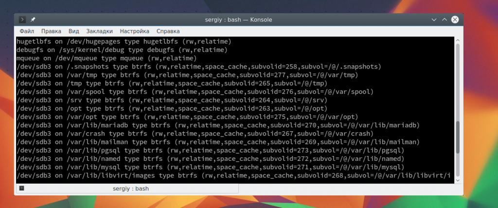 Посмотреть список всех примонтированных устройств можно просто выполнив mount без параметров: