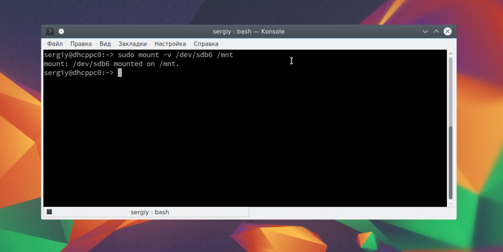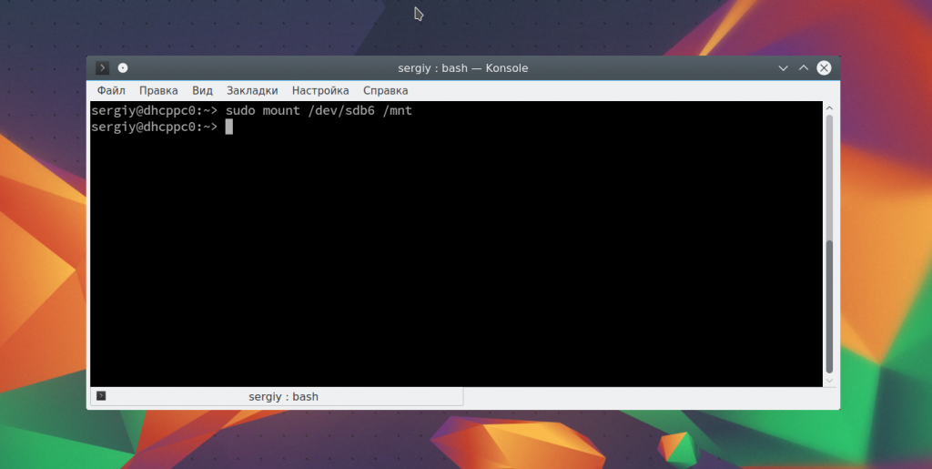 Монтирование разделов с помощью mount выполняется очень просто. Фактически в большинстве случаев будет достаточно упрощенной версии команды. Например, смонтируем раздел /dev/sdb6 в папку /mnt: