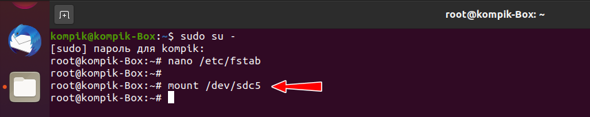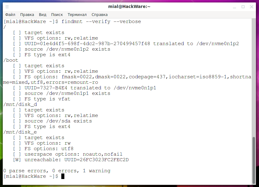 Обратите внимание, что если вы что-то неправильно сделали в файле /etc/fsta, то система не сможет загрузиться в графический интерфейс и вам придётся всё исправлять из консоли. Ссылка на дополнительную инструкцию в конце этой статьи.. Для проверки записей в файле /etc/fstab используйте команду