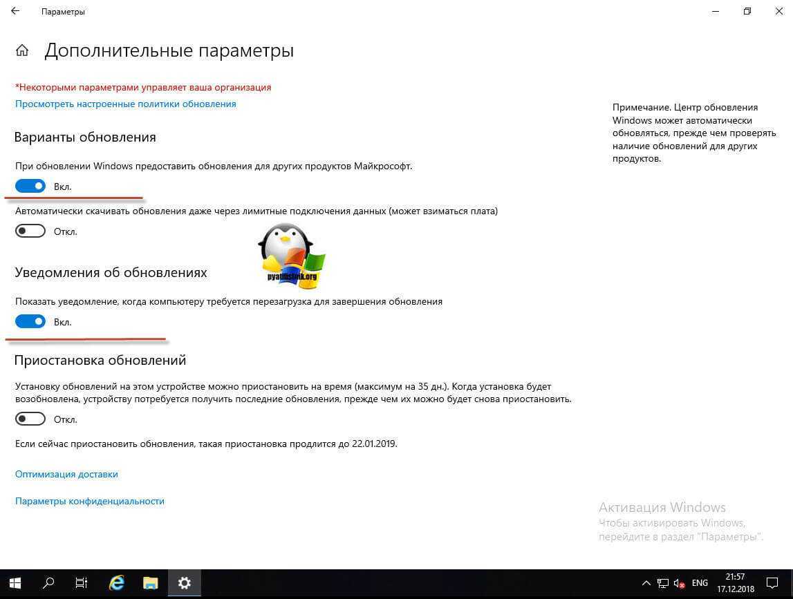 - Показать уведомление, когда компьютеру требуется перезагрузка для завершения обновления