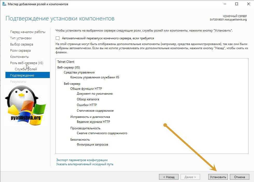 Нажимаем Далее и в следующем окне Установить. Дожидаемся окончания процесса установки и перезагружаем сервер.