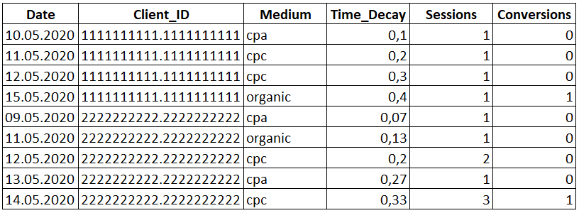 У нас есть таблица с id посетителя (им может быть Client ID, номер телефона и тп.), датами и количеством посещений сайта, а также с информацией о достигнутых конверсиях.