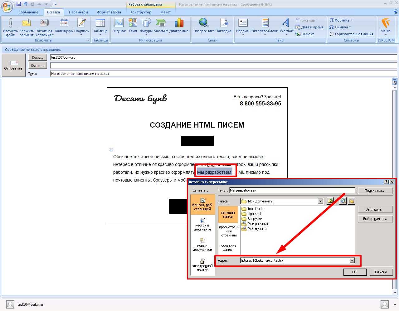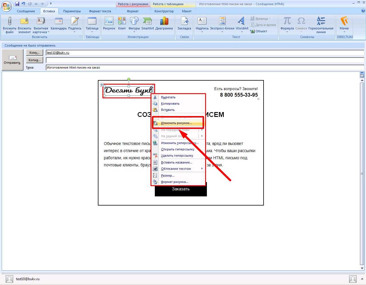 Небольшую правку нашего отправления можно делать прямо в Outlook, работая с визуальными объектами письма. Текст можно выделить, удалить, вставить — как в обычном текстовом редакторе.