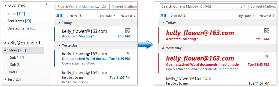 В почтовых папках Outlook 2021 непрочитанные электронные письма выделяются мелким синим шрифтом, как показано ниже. Это может быть недостаточно очевидно, чтобы выделить непрочитанные электронные письма. В этой статье мы предлагаем решение, позволяющее выделить все непрочитанные электронные письма крупным красным шрифтом.