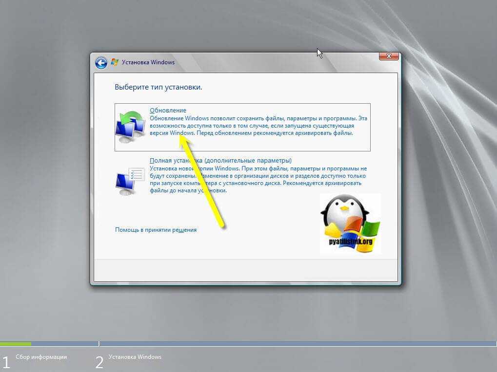 Принимаем лицензию и до ходим до момента выбора типа установки, выбираем верхний пункт «Обновление».
