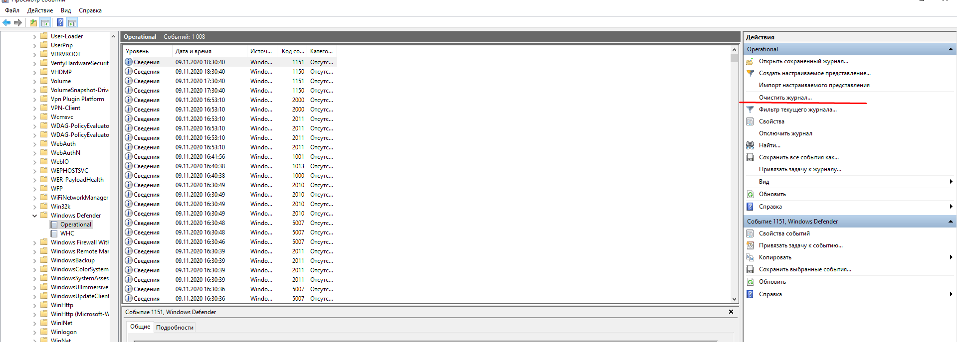 Появится окно с тремя колонками. Уходим в левую, и там проходим путь: «Журналы приложений и служб» => «Microsoft» => «Windows» => «Windows Defender» = > «Operational».