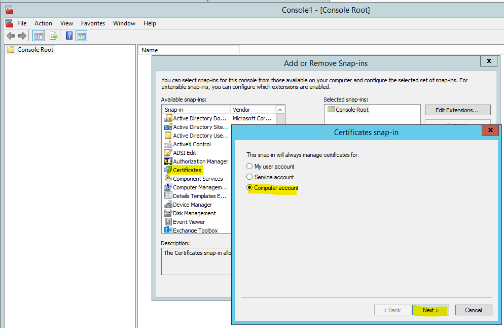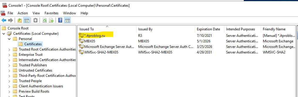 1. Запустить MMC консоль управления сертификатами для локального компьютера на первом сервер Exchange 2016: