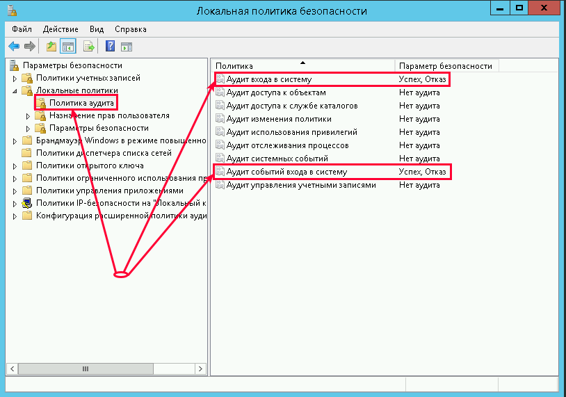 «). Перейдите в «Локальные политики» —> «Политика аудита» и включить регистрацию сбоев для «Аудита входа в систему» и «Аудита событий входа в систему»:
