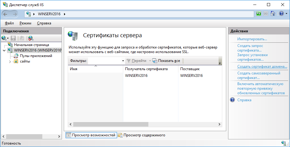 Далее нужно создать сертификат для шлюза служб удаленных рабочих столов. Запустите Диспетчер служб IIS, выберите пункт Сертификаты сервера. На панели справа выберите Создать сертификат домена. Введите необходимые сведения (рис. 11).
