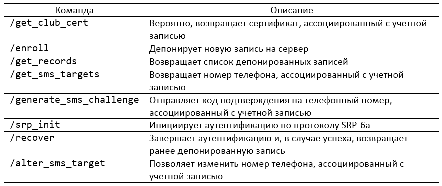 Аудит позволяет определить список команд, реализуемых службой депонирования. На соответствующем скриншоте представлены команды и их описание. Особо хотелось бы остановиться на последней команде — с ее помощью возможно изменить номер телефона, ассоциированный с текущей учетной записью. Наличие этой команды делает многофакторную аутентификацию, используемую при восстановлении iCloud Keychain (пароль Apple ID + iCSC + устройство), заметно менее надежной, так как позволяет исключить один из факторов. Интересно и то, что пользовательский интерфейс iOS не позволяет выполнить эту команду — в нем просто нет такой опции (по крайней мере я ее не нашел).