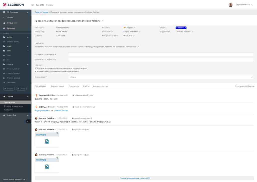 Система представляет собой центр обработки и реагирования на инциденты информационной безопасности и включает в себя таск-менеджер с инструментами для постановки задач. Встроенный в Zecurion DLP инструмент позволяет своевременно расследовать инциденты внутри компании и выявлять нарушителей.