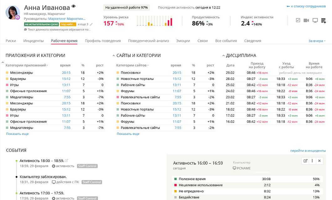 При использовании модуля Staff Control в карточке сотрудника в DLP-системе появляется отдельная вкладка со всеми показателями, событиями активности и наглядными диаграммами для быстрой оценки рабочего времени сотрудника
