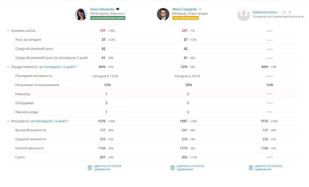 Показатели Staff Control у разных сотрудников легко сравнивать с помощью специального функционала — необходимо лишь выбрать нужных сотрудников и нажать «Сравнить». Результат сравнения также может быть выгружен или прикреплен к расследованию