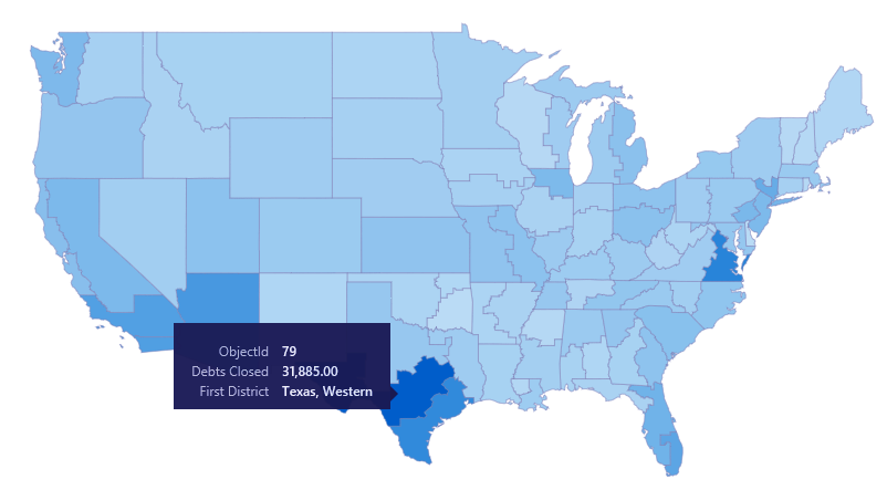 Поскольку состояния могут быть разделены на разные области, нам нужно использовать пользовательское очертание формы. Добавив в Power BI Desktop руководство TopoJSON по юридическому региону США, мы сможем представить ежегодную информацию главного финансового прокурора. Картинка ниже показывает как раз этот случай.