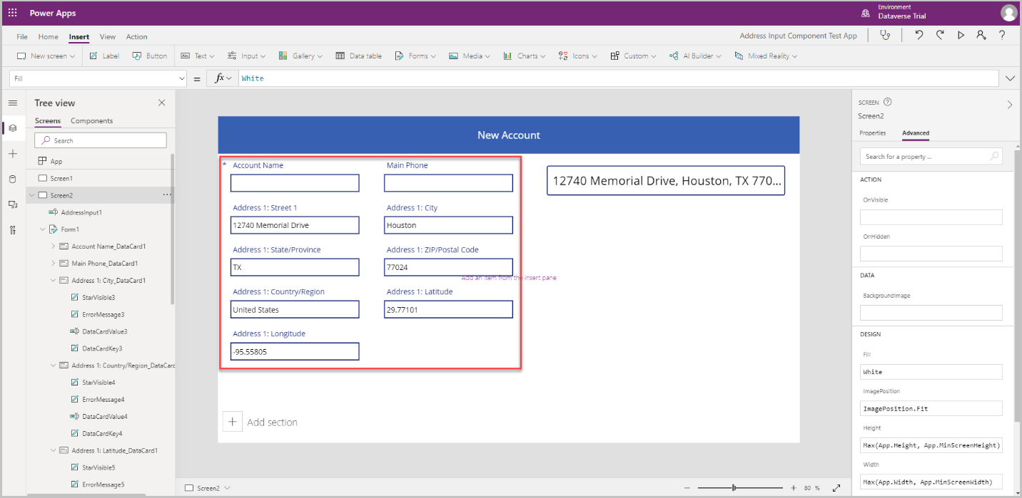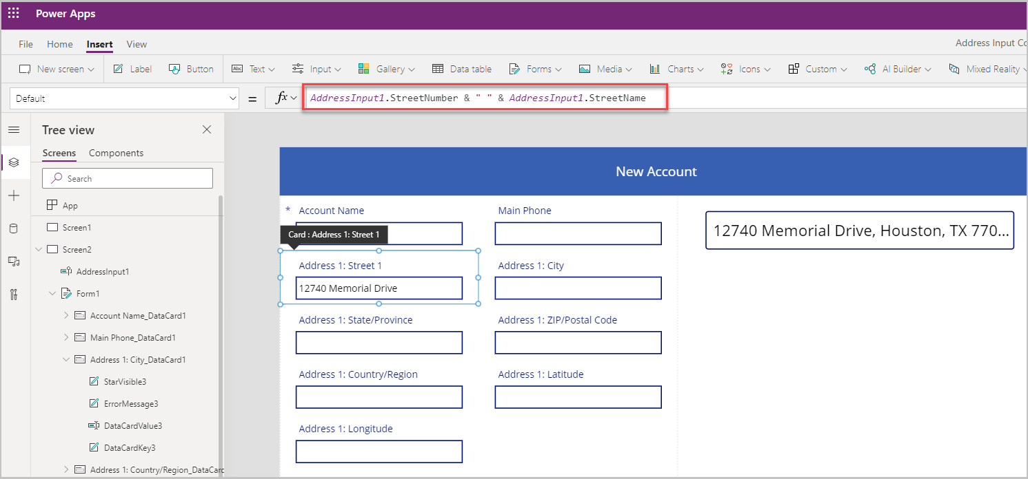 Мы установим значения карточки данных на соответствующее значение свойства из ввода адреса.